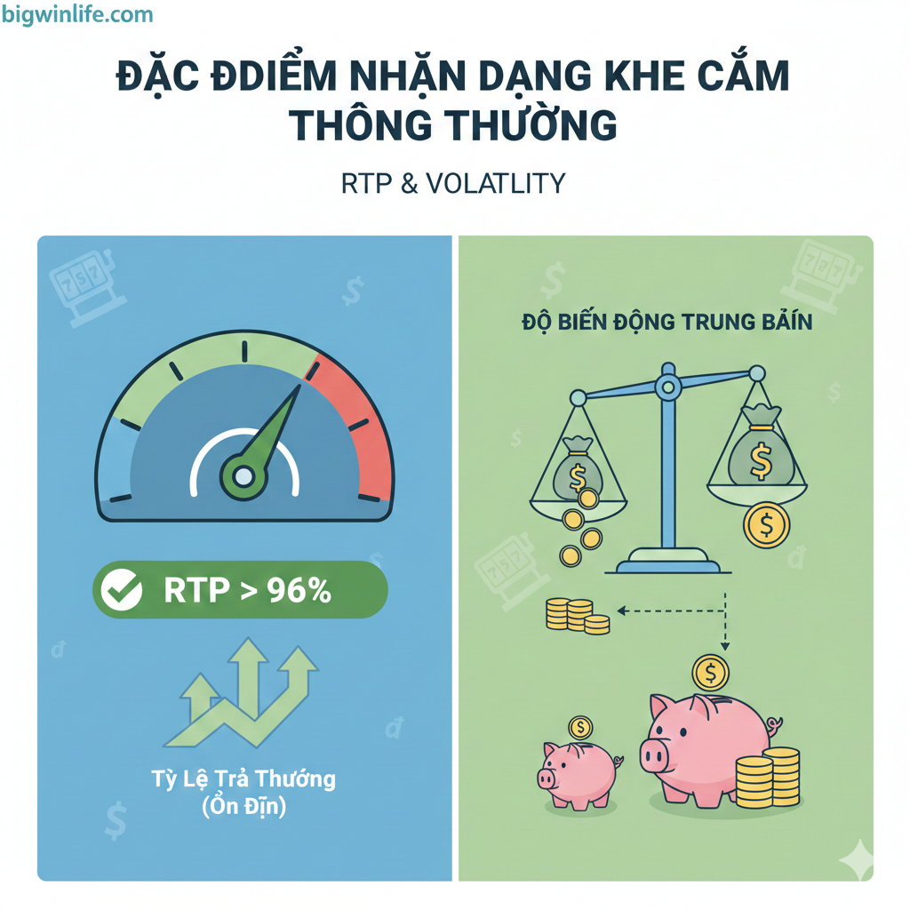 96%' màu xanh lá cây, ám chỉ sự ổn định. Bên kia là một biểu tượng 'Độ biến động Trung bình' (Medium Volatility) được thể hiện bằng một biểu tượng cân bằng (scale) với hai túi tiền, một túi nhỏ và đều đặn, một túi lớn hơn nhưng hiếm gặp. Sử dụng các biểu tượng tiền tệ (VNĐ hoặc $), máy slot mini, và các mũi tên chỉ sự phân phối thưởng. Màu sắc chủ đạo là xanh dương và xanh lá cây, tạo cảm giác tin cậy và phân tích.”>